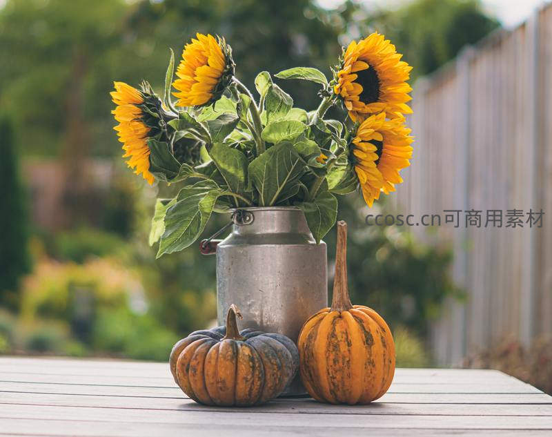 金属奶罐盛放向日葵,搭配两个小南瓜置于木桌,营造温馨秋日庭院氛围,兼具怀旧与生活美学。