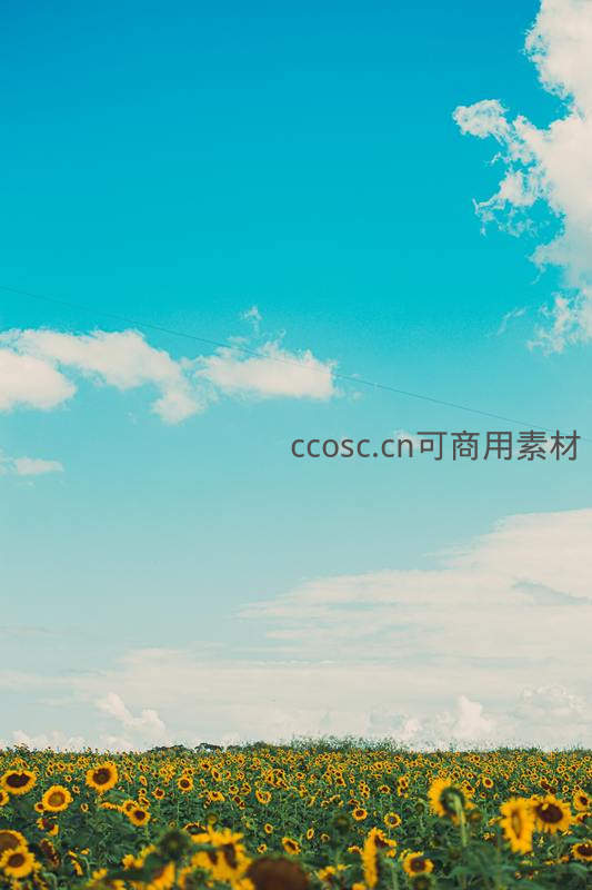 湛蓝的天空点缀着朵朵白云,下方是连绵不绝的向日葵花田,构图简洁大气,传递出开阔、宁静与自然之美的视觉享受。