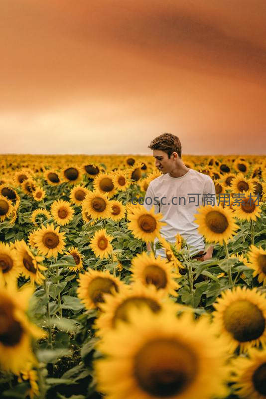 一位年轻男子置身于无垠的向日葵花海中,头顶是绚烂的晚霞,他侧身微笑,享受着大自然的宁静与壮丽,画面充满诗意。