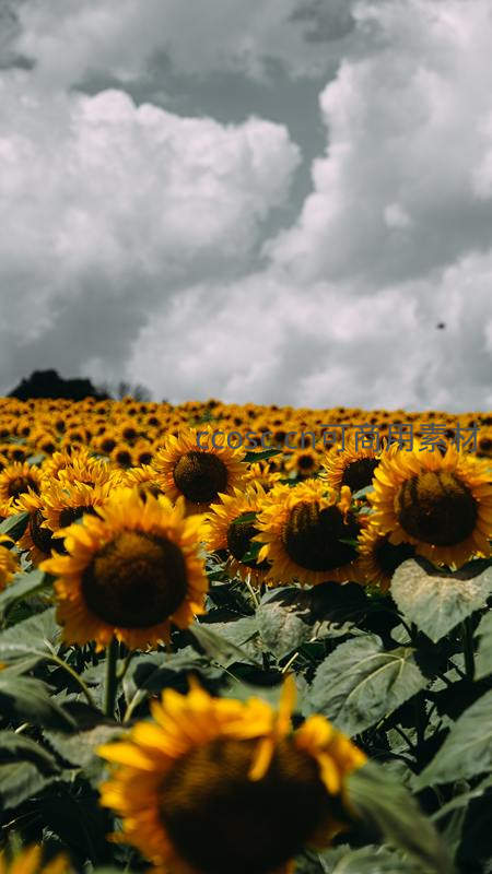 大片向日葵在厚重乌云的笼罩下昂首挺立,强烈的明暗对比凸显了花朵的坚韧与生命力,预示着风雨欲来的自然力量。