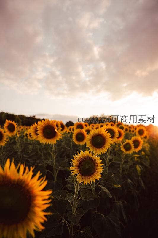 柔和的金色光线洒满向日葵花田,天空云层被染成粉橙色,近处花朵清晰,远处朦胧,构成一幅宁静而温暖的田园画卷。