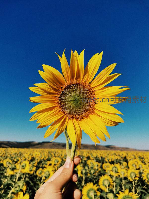 一只手举着一朵盛开的向日葵,背后是纯净的深蓝色天空和远处的花田,营造出宁静而充满希望的氛围。