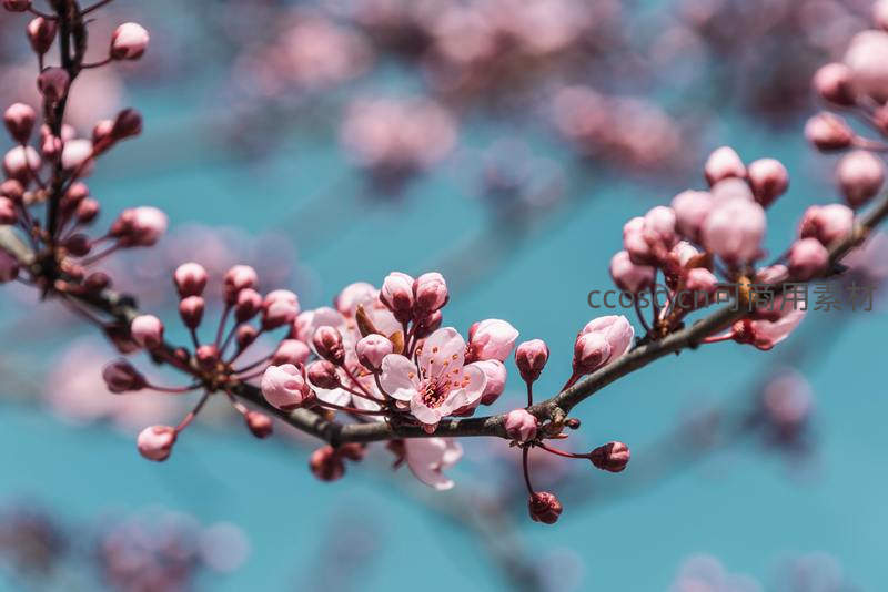 细枝上粉红花苞与初绽花瓣交相辉映,背景虚化如梦似幻,展现生命萌动的静谧瞬间,传递春日的温柔与期待。