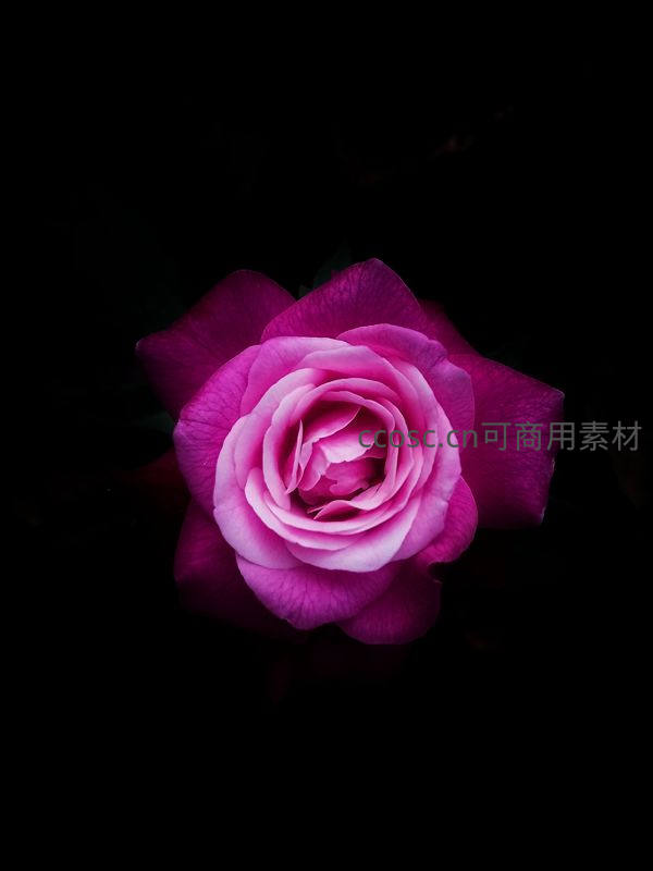 在深邃的黑色背景下,一朵紫色玫瑰被聚光灯照亮,花瓣层层叠叠,散发出神秘而高贵的气息,宛如夜色中的精灵。