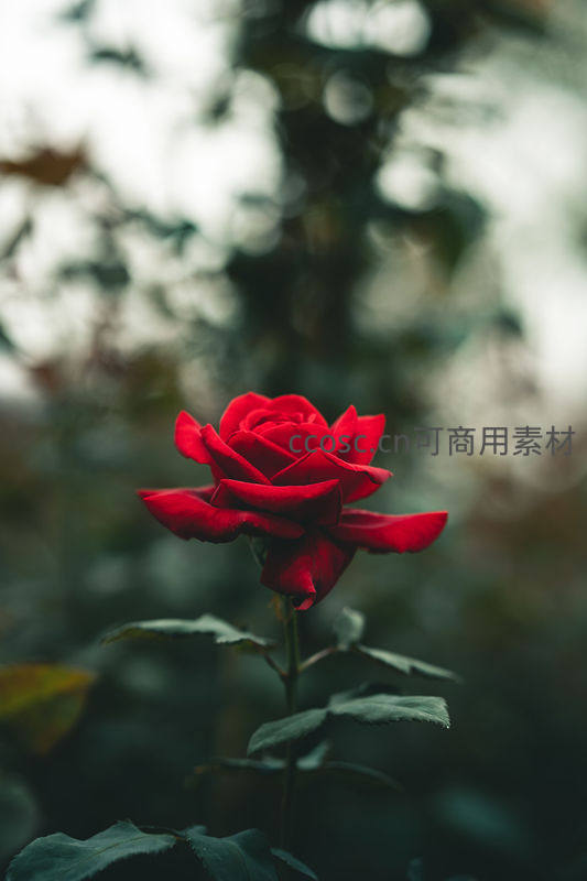 深红玫瑰独绽,林间朦胧意境美