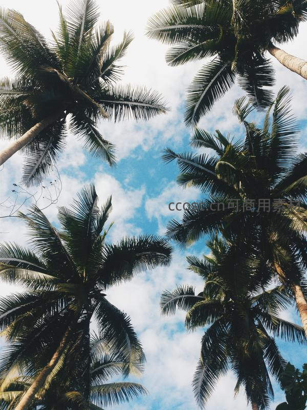 仰望椰冠,蓝天白云间绿叶婆娑如画
