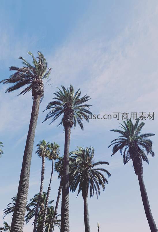 多棵棕榈树直指苍穹,蔚蓝天空下的热带风景