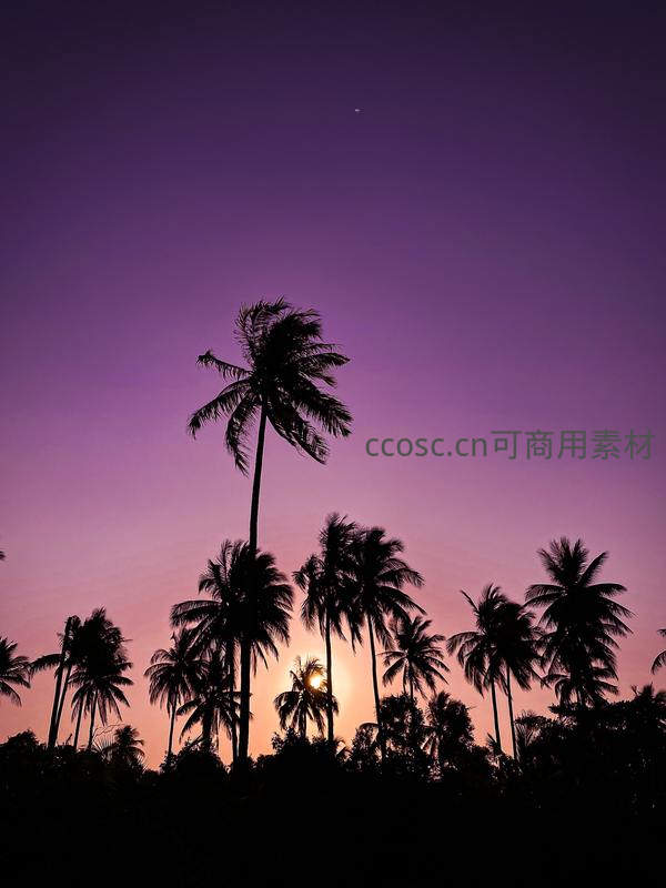 深紫色天空下,多棵椰树剪影错落有致,夕阳余晖穿透枝叶,营造出梦幻浪漫、宁静致远的黄昏景象。