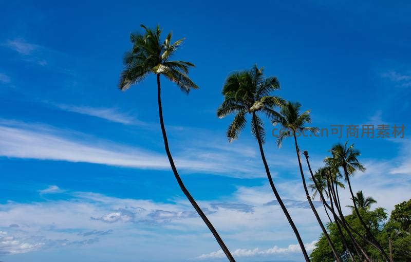 高耸的椰子树在湛蓝天空与朵朵白云的映衬下,枝叶随风轻摆,展现出热带地区特有的宁静与生机。