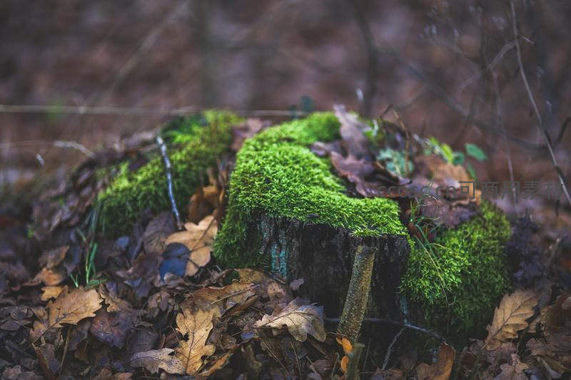 青苔覆盖的树桩静卧林间落叶中