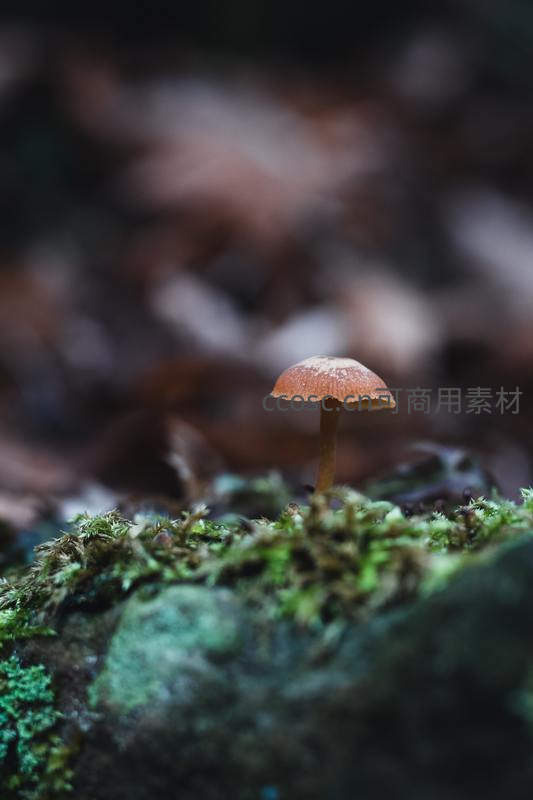 孤寂小蘑菇在湿润苔石上静静生长