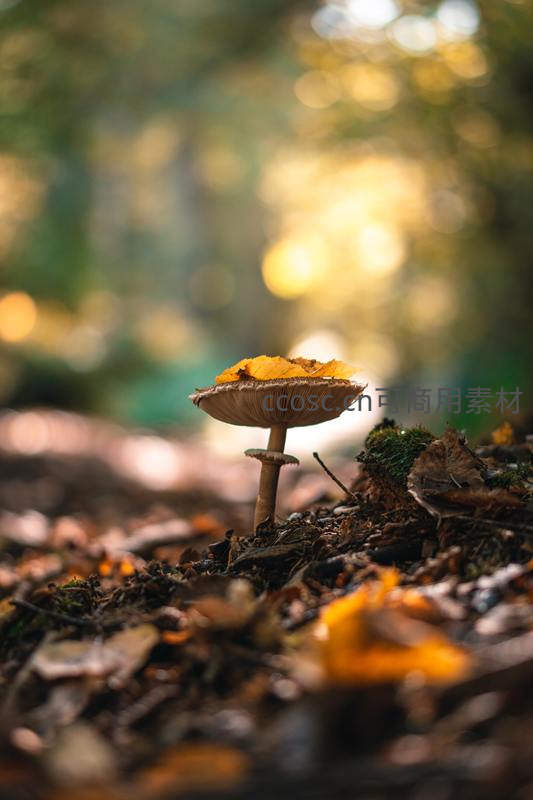 在温暖的秋日阳光下,一朵蘑菇静静伫立于林间,伞盖上覆盖着金黄落叶,背景是朦胧的光斑,营造出宁静而诗意的氛围。