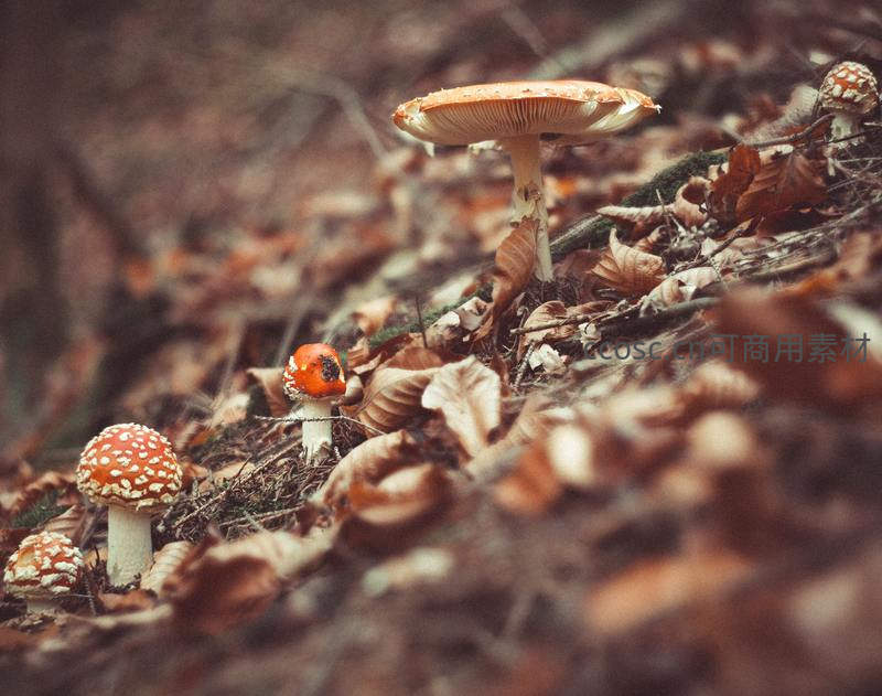 几朵标志性的红顶白点毒蝇伞点缀在厚厚的枯叶之中,鲜艳的色彩在萧瑟的秋景里格外醒目,提醒人们大自然的美丽往往伴随着不可忽视的危险与禁忌。