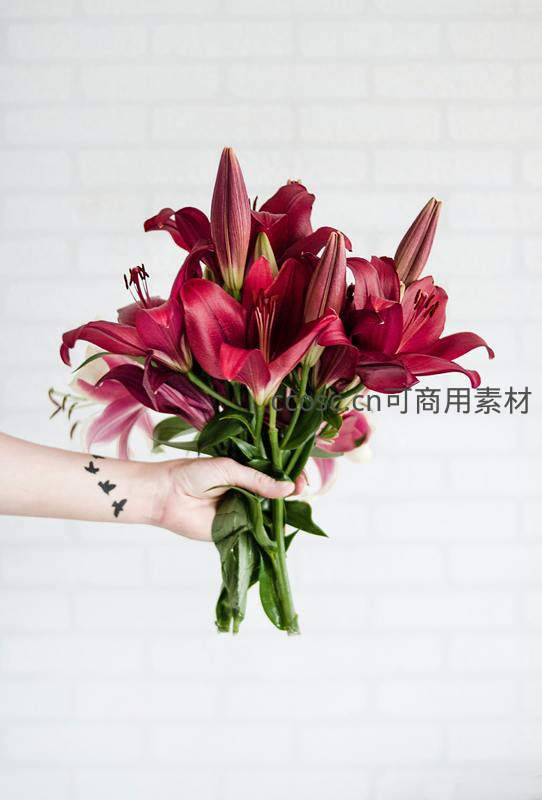 一束深红色百合在素雅白砖墙前被温柔捧起,花瓣层叠绽放,传递出热烈而优雅的情感氛围。