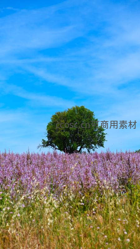 一片梦幻般的紫色花海延伸至天边,中央一棵绿树静静伫立,与纯净的蓝天相映成趣,充满诗意与宁静。