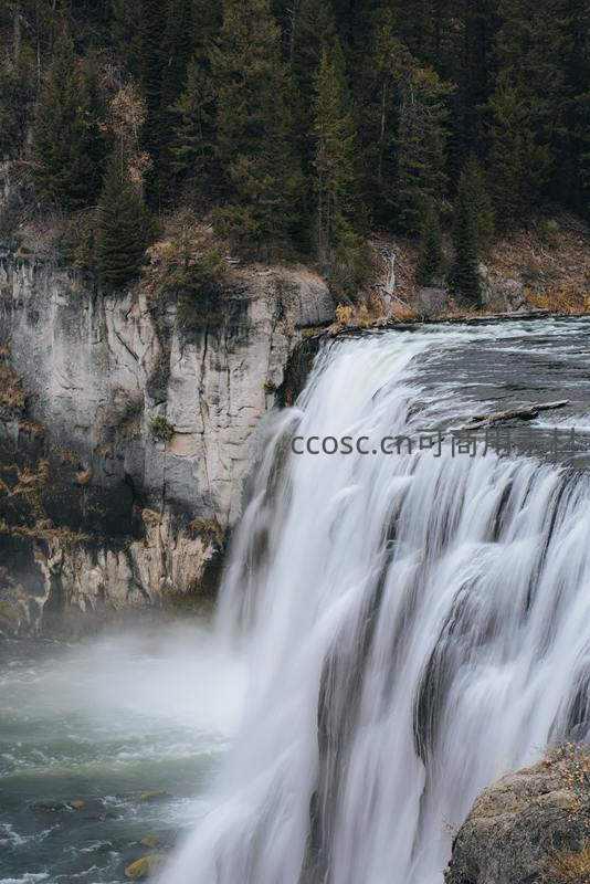 一道宽阔的瀑布从陡峭岩壁奔腾而下,激起漫天水雾。背景是苍翠挺拔的针叶林,水流在慢门下呈现出绸缎般的质感,展现出大自然原始而雄浑的力量之美。
