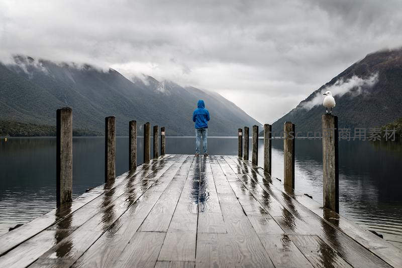 湿漉漉的木质栈道上,一个穿蓝色连帽衫的人独自伫立远眺,身旁海鸥停驻,背景是云雾缭绕的群山与平静湖水。