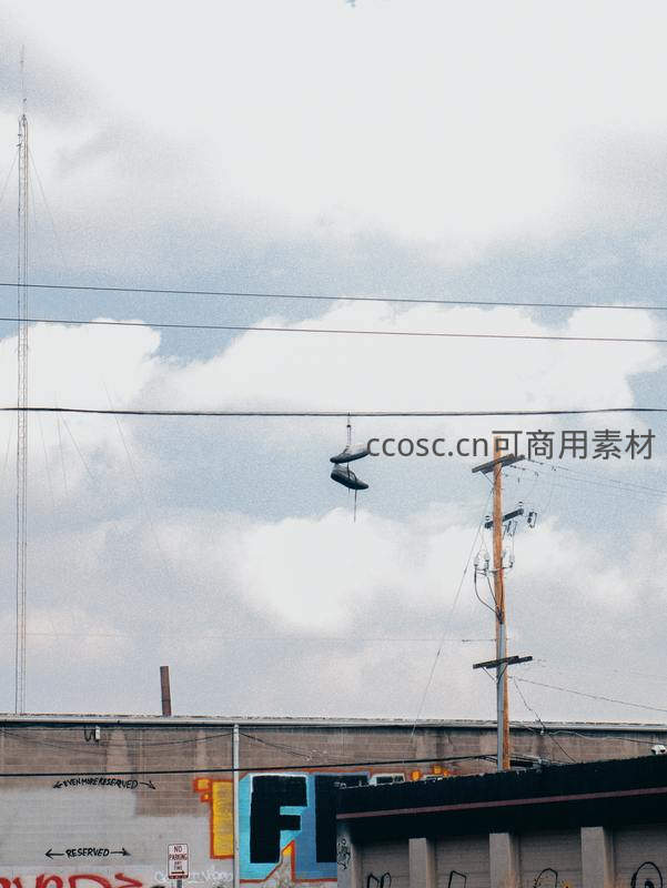 电线杆上悬吊旧鞋,城市街头涂鸦墙
