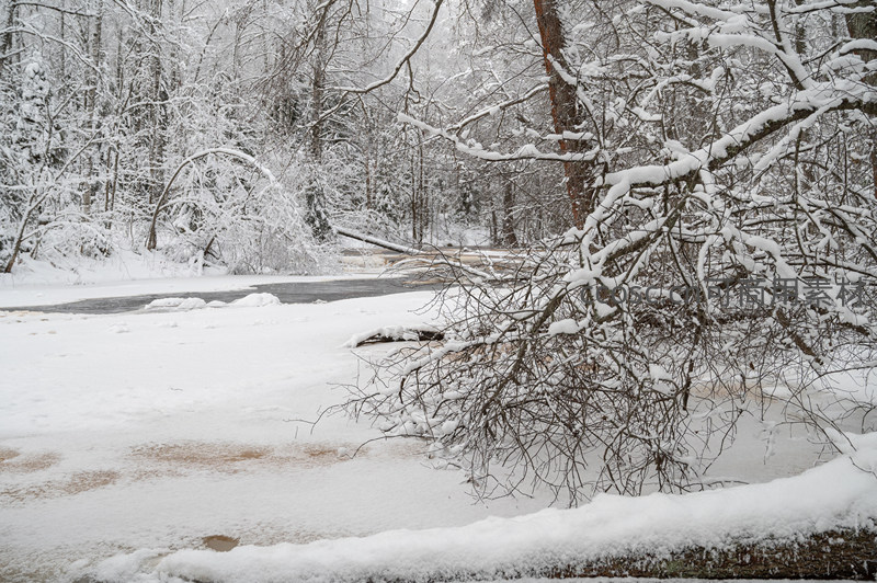 雪中溪流蜿蜒流淌