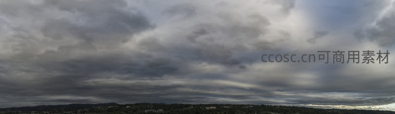 广角镜头捕捉城市边缘与连绵山脉,上方厚重云层低垂几乎触地,为现代建筑群增添一份神秘与静谧的自然背景。
