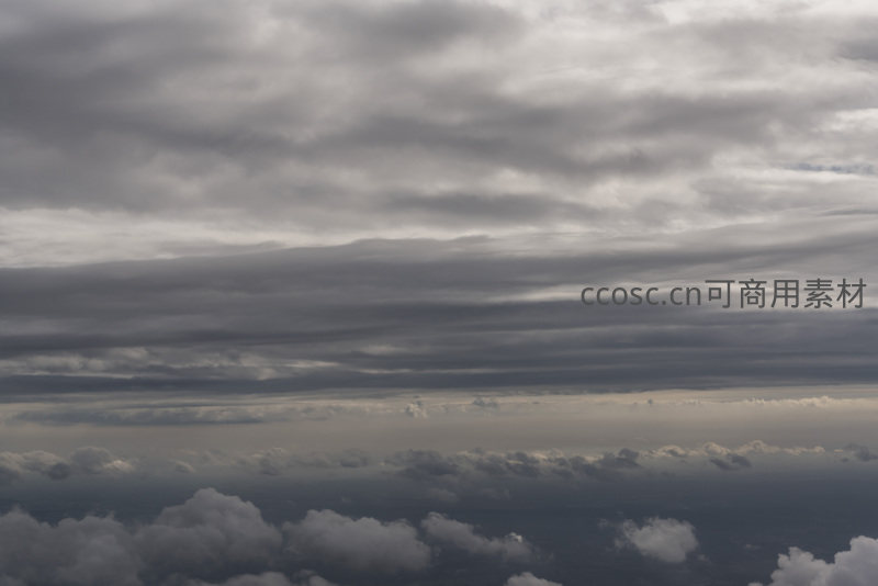 从高空视角捕捉到的壮阔云海,层层叠叠的云朵在灰白光影中铺展,仿佛一幅流动的水墨画,展现了大自然磅礴而静谧的美感。