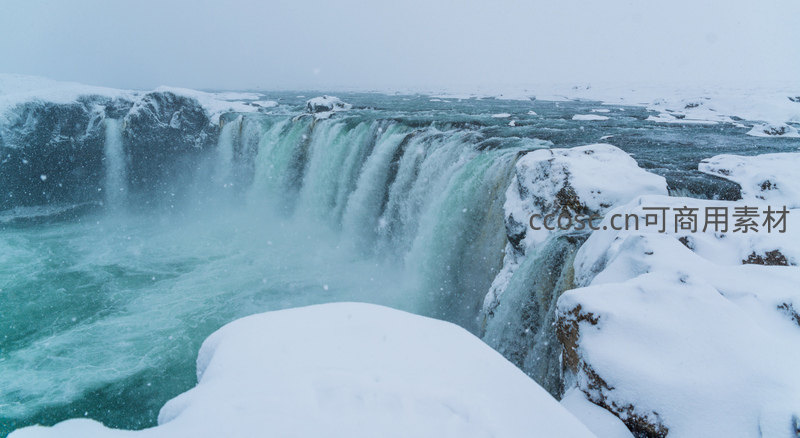 在漫天飞雪中,碧绿的瀑布从覆雪的悬崖倾泻而下,水花四溅,与洁白的雪地形成鲜明对比,展现出大自然的磅礴与静谧。