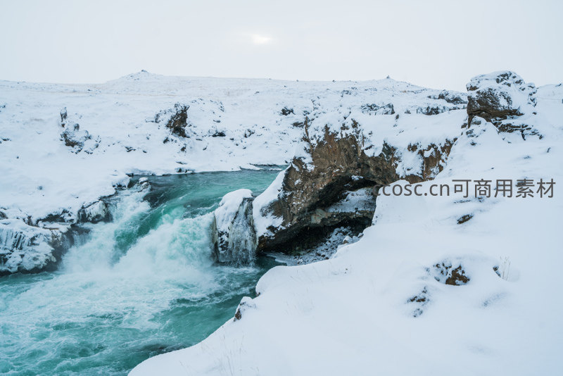 在广袤的雪原中,一条汹涌的冰蓝色河流穿越峡谷,激起白色浪花,展现了大自然在严冬中的磅礴生命力。