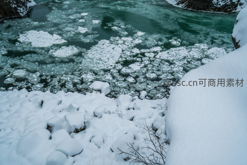 清澈的河水表面漂浮着大小不一的碎冰,与岸边厚厚的积雪相映成趣。阳光透过云层洒下,为这片宁静的冬日河景镀上了一层柔和的光辉。