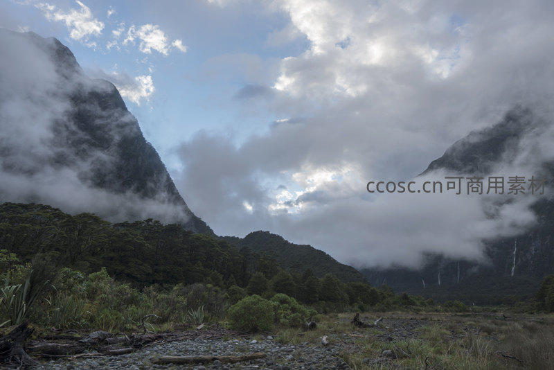 阳光撕开厚重云层,金色光芒洒在深谷中的森林与草地之上,两侧山体巍峨,云雾缠绕,构成一幅壮阔自然画卷。