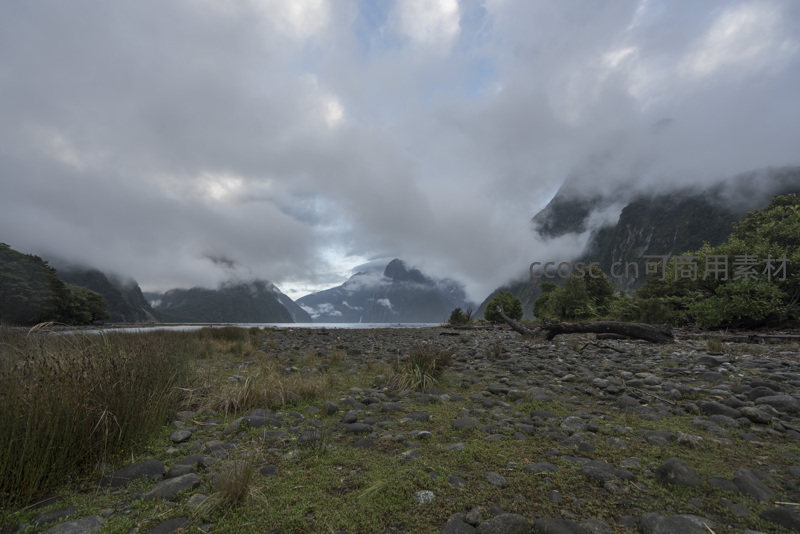前景遍布卵石与稀疏草丛,中景湖水平静,远景群山被云雾半掩,天空阴沉却透出微光,尽显大自然的辽阔与苍凉。