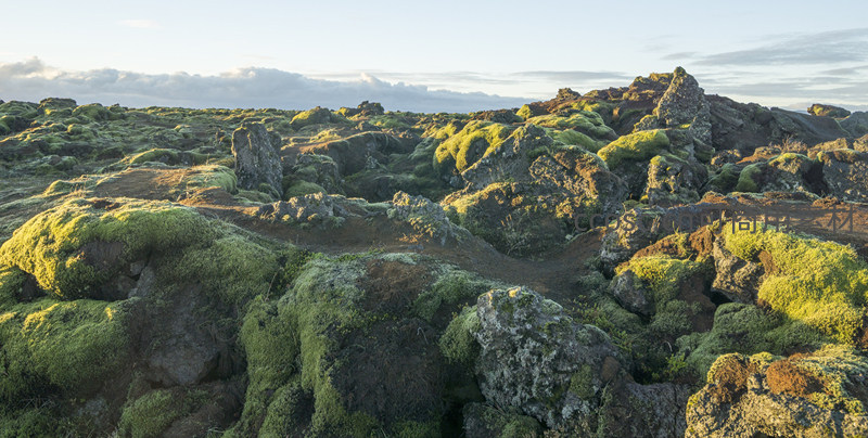 云隙间透出的金色阳光精准洒落在连绵的苔藓岩丘上,明暗对比强烈,凸显了地貌的立体感与自然的戏剧性瞬间。
