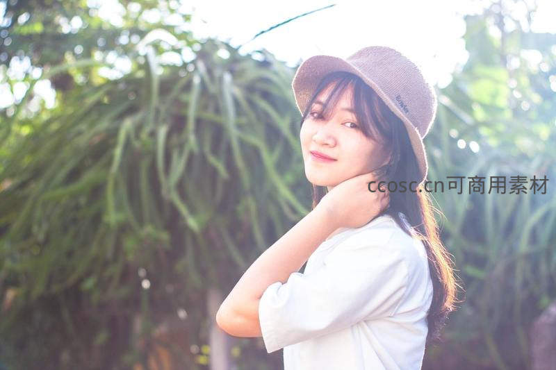 阳光下的温柔微笑,草帽少女与绿意相伴