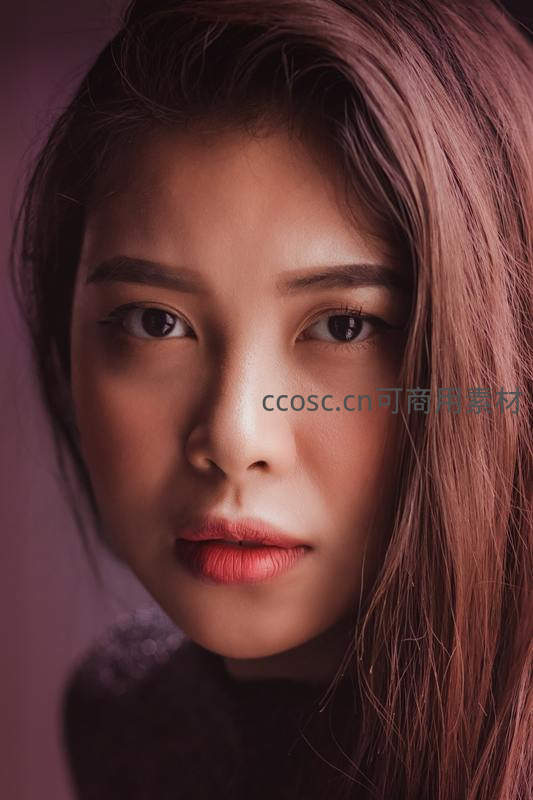 一张近距离拍摄的女性面部特写,红棕色长发垂落,妆容精致,唇色鲜艳,眼神坚定直视镜头,背景为柔和紫色调,凸显人物魅力与情绪张力。