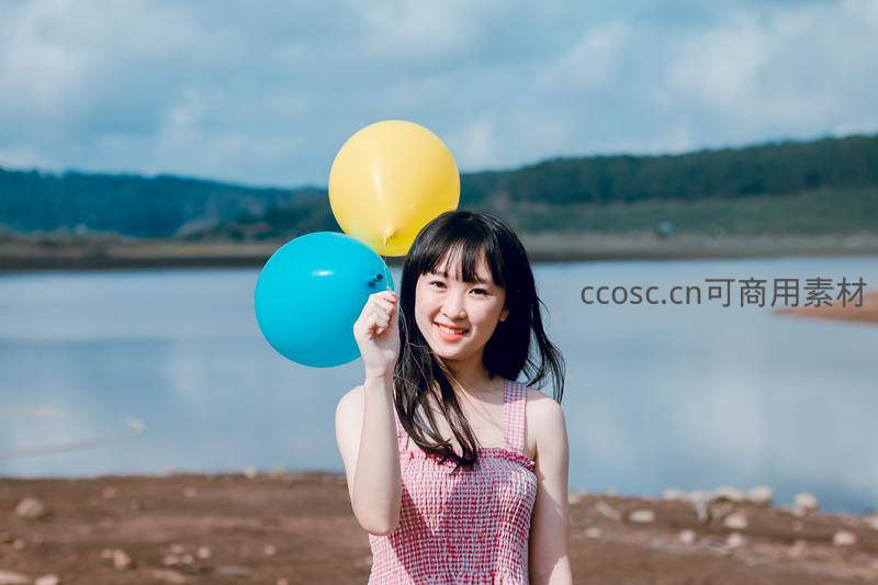 湖畔少女手持彩色气球微笑