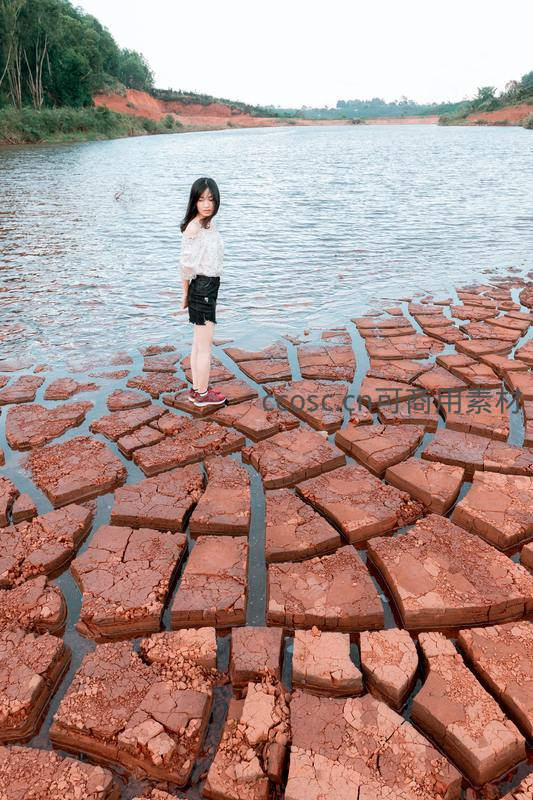 女孩站在干涸龟裂的红土湖岸上,水面倒映着破碎的大地纹理,形成独特的视觉冲击,宁静中透着荒凉之美。