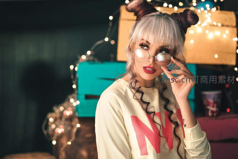 女孩手扶圆框眼镜,眼神俏皮斜视,身着印字卫衣,背景彩箱与暖灯交织,呈现轻松愉悦的街头时尚感。