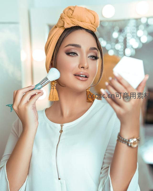 橙色头巾女子对镜轻扫腮红美妆