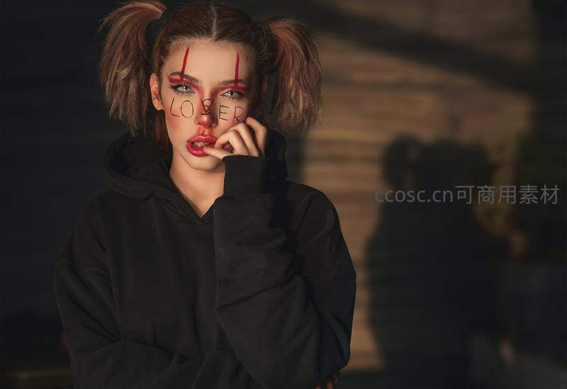 在昏暗背景与斜射光线下,少女身着黑色连帽衫,面部带有艺术妆容,手指轻触唇边,营造出神秘而富有故事感的氛围。