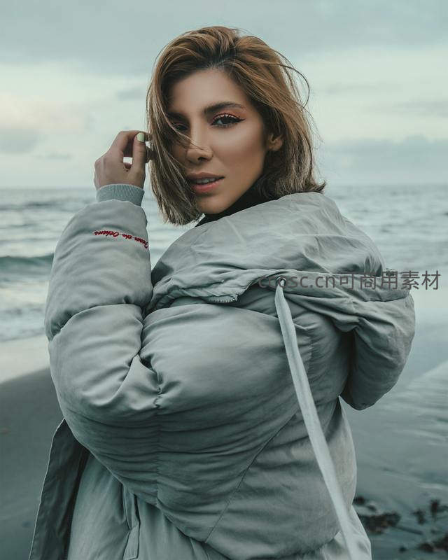 海边灰羽绒服女子回眸凝望