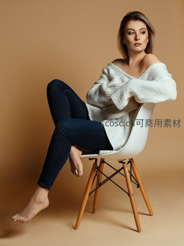 一位年轻女性身着宽松白色毛衣与深色牛仔裤,赤脚坐在现代风格的白色椅子上,姿态放松,眼神迷离,整体氛围温馨而时尚。