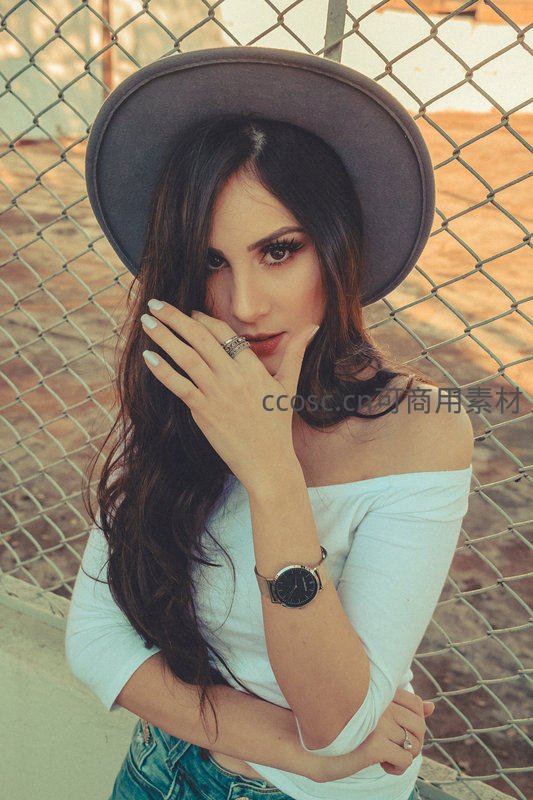 女子戴着宽檐帽倚靠铁丝网,手指轻触脸颊,眼神深邃,搭配简约服饰,展现出都市街头的时尚感。