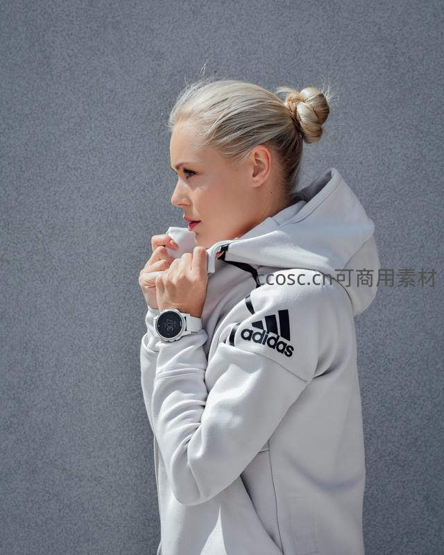金发女子身穿灰色Adidas连帽衫,佩戴智能手表,正低头轻啜咖啡,背景简洁,展现健康生活方式与品牌时尚结合。