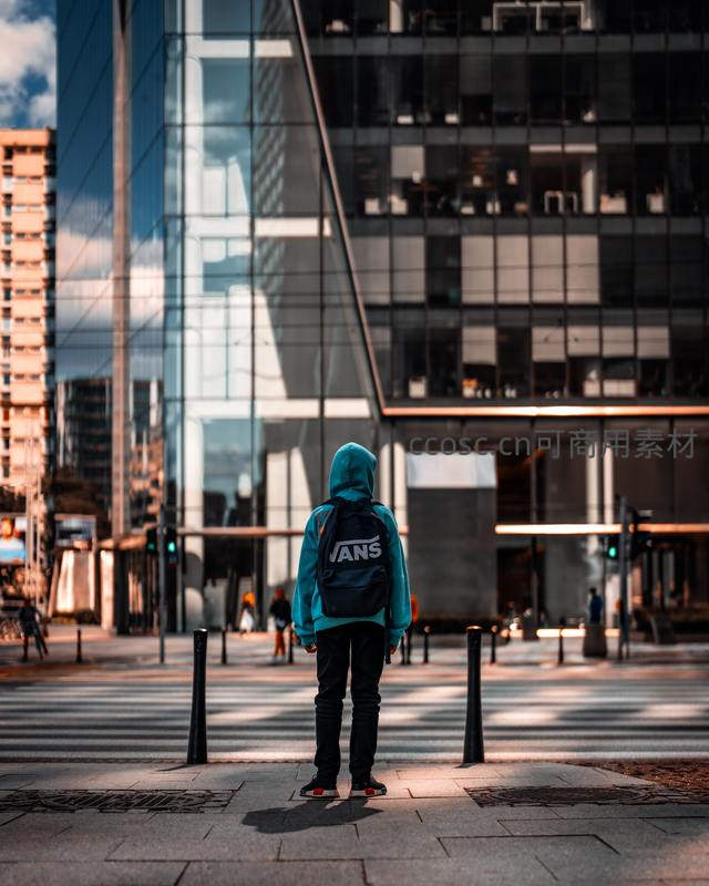 一名身穿连帽衫、背着背包的少年站在城市街头,身后是高耸的玻璃幕墙建筑,反射着蓝天白云,展现出现代都市的疏离与活力。