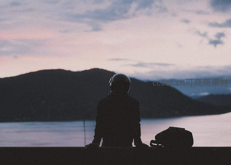 戴着头盔的骑士坐在湖边护栏上,背对镜头凝望远方山峦与暮色湖水,身旁放着背包,画面充满旅途中的静谧与思考的意境。