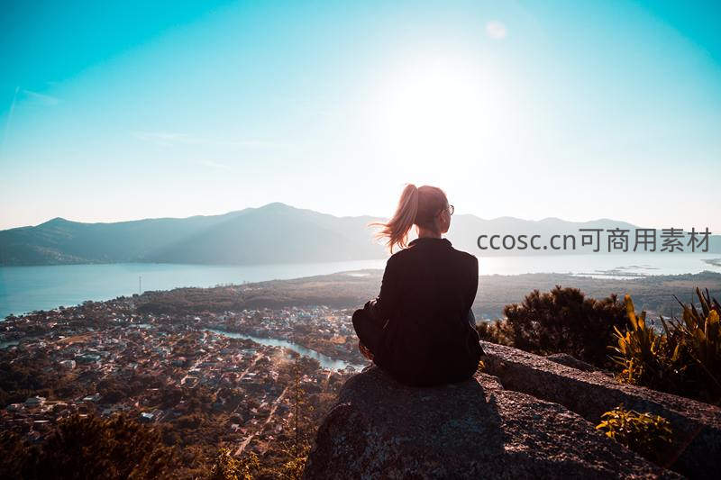 女子盘坐岩石之上,俯瞰山下湖泊与城镇,晨光洒落,远山如黛,城市静谧安详,展现人与自然和谐共处的美好画面。