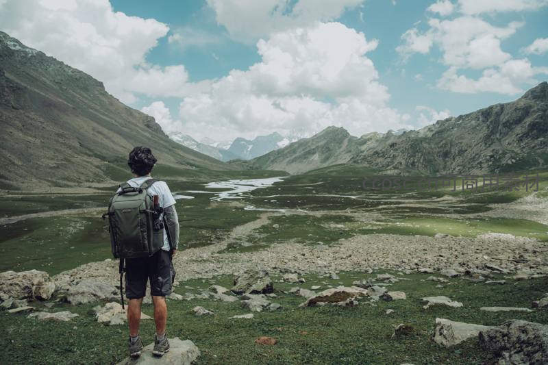 一名背着登山包的旅人站在岩石上,凝视前方壮丽的高山河谷,蓝天白云下绿草如茵,远处雪峰隐约可见,尽显自然雄浑之美。