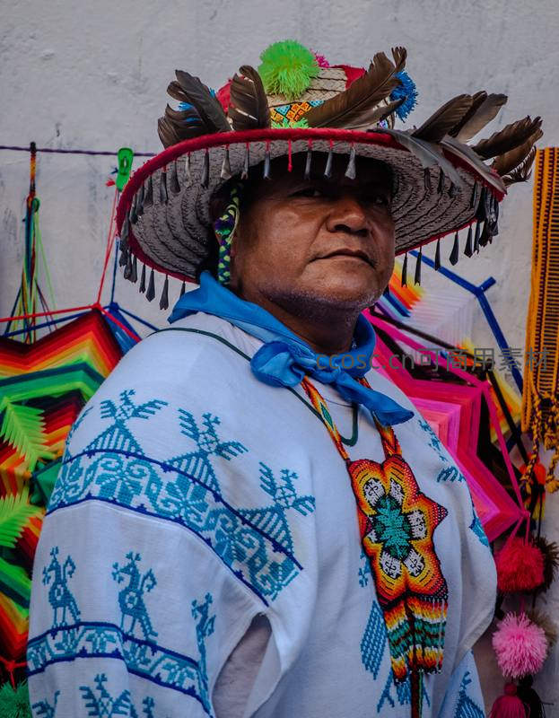 头戴装饰羽毛与绒球宽边帽的民族艺人,身着蓝白刺绣上衣,胸前挂彩色挂饰,背景是五彩斑斓的手工艺品墙。