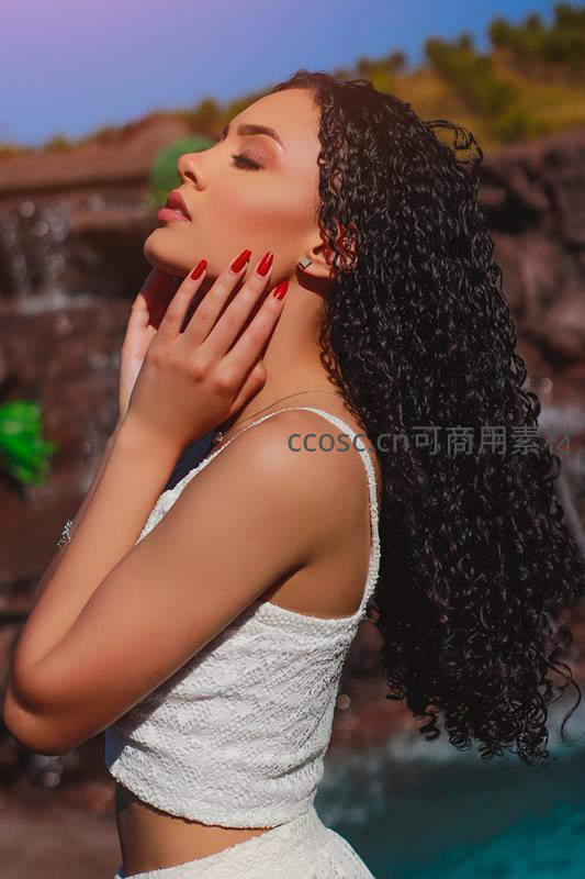 卷发女子闭目享受自然瀑布风光