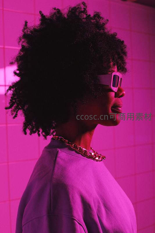 黑人女性在粉紫色霓虹灯光下侧脸微笑,蓬松卷发搭配金属链项链和未来感墨镜,展现都市潮流美学。
