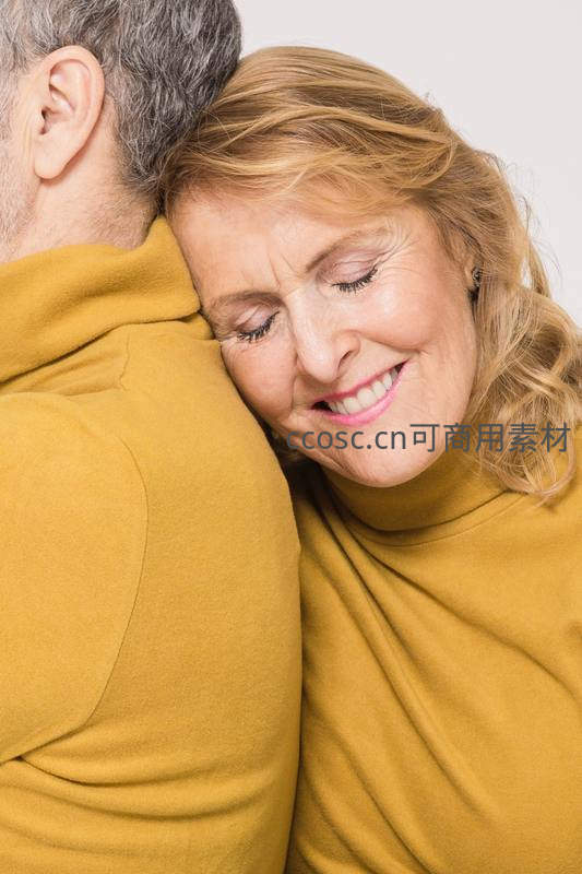 一对老年夫妇身穿同色系毛衣,深情相拥,女方脸上洋溢着满足而温暖的笑容,画面充满了历经岁月沉淀后的深厚爱意与宁静幸福。